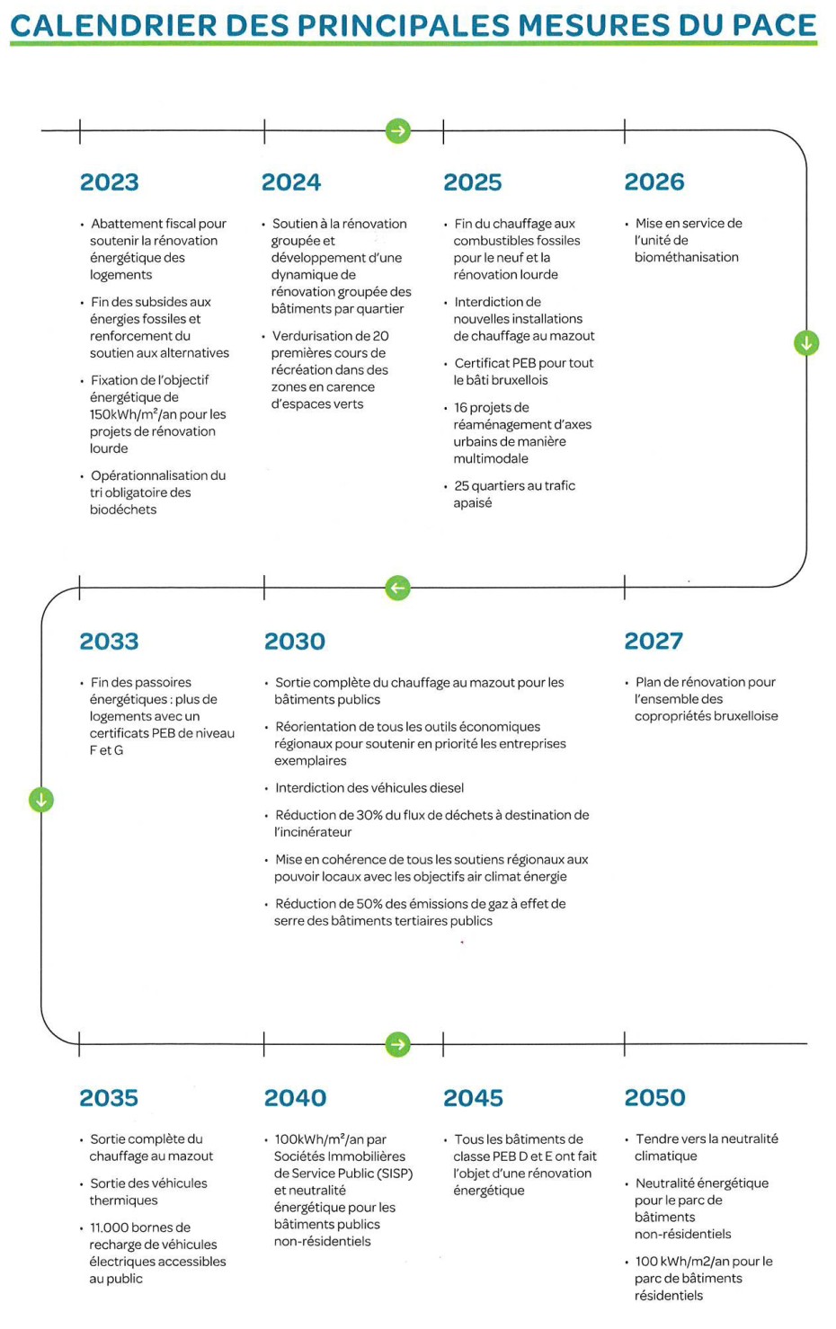 Pour atteindre les objectifs fixés lors des Accords de Paris de 2015 sur le climat, la Région de Bruxelles-Capitale a donc adopté une série de mesures contenues dans le PACE (Plan Air Climat Energie de la Région de Bruxelles-Capitale).